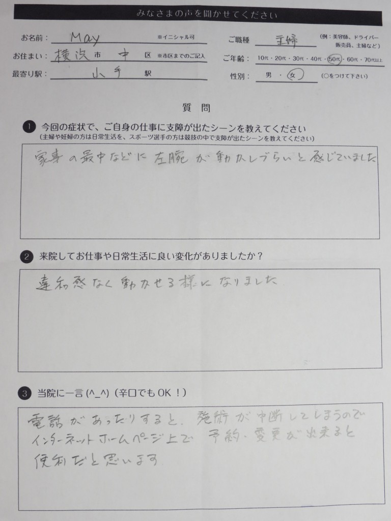 専業主婦の方、家事の最中に左腕に違和感がありご来院。