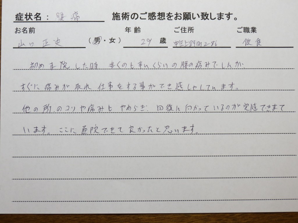 横浜関内の居酒屋 の店長さんが腰痛で来院して頂きました。