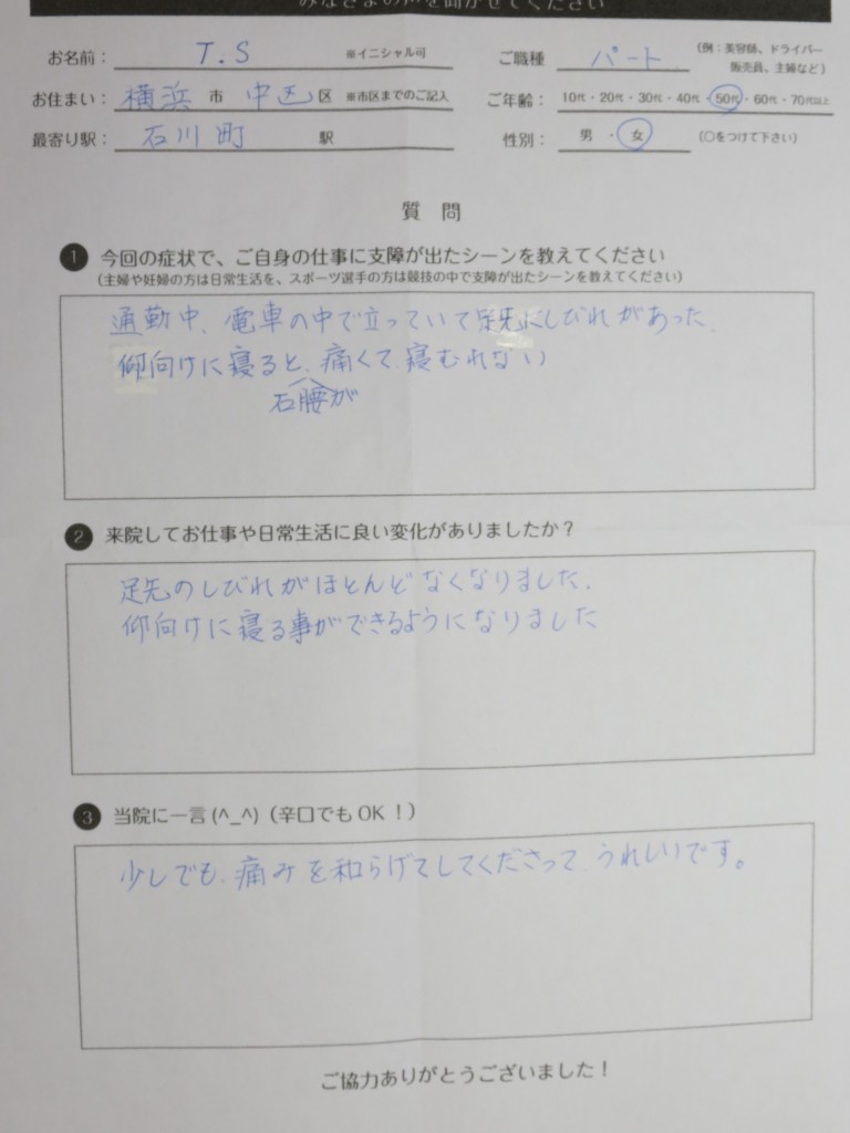 脚先のしびれと右腰が痛く睡眠不足でご来院頂きました。